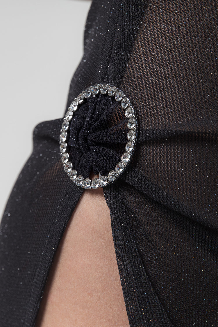 It's one-shoulder cut is all drama, while the glittering crystal ring draws attention to the leg-baring slit.